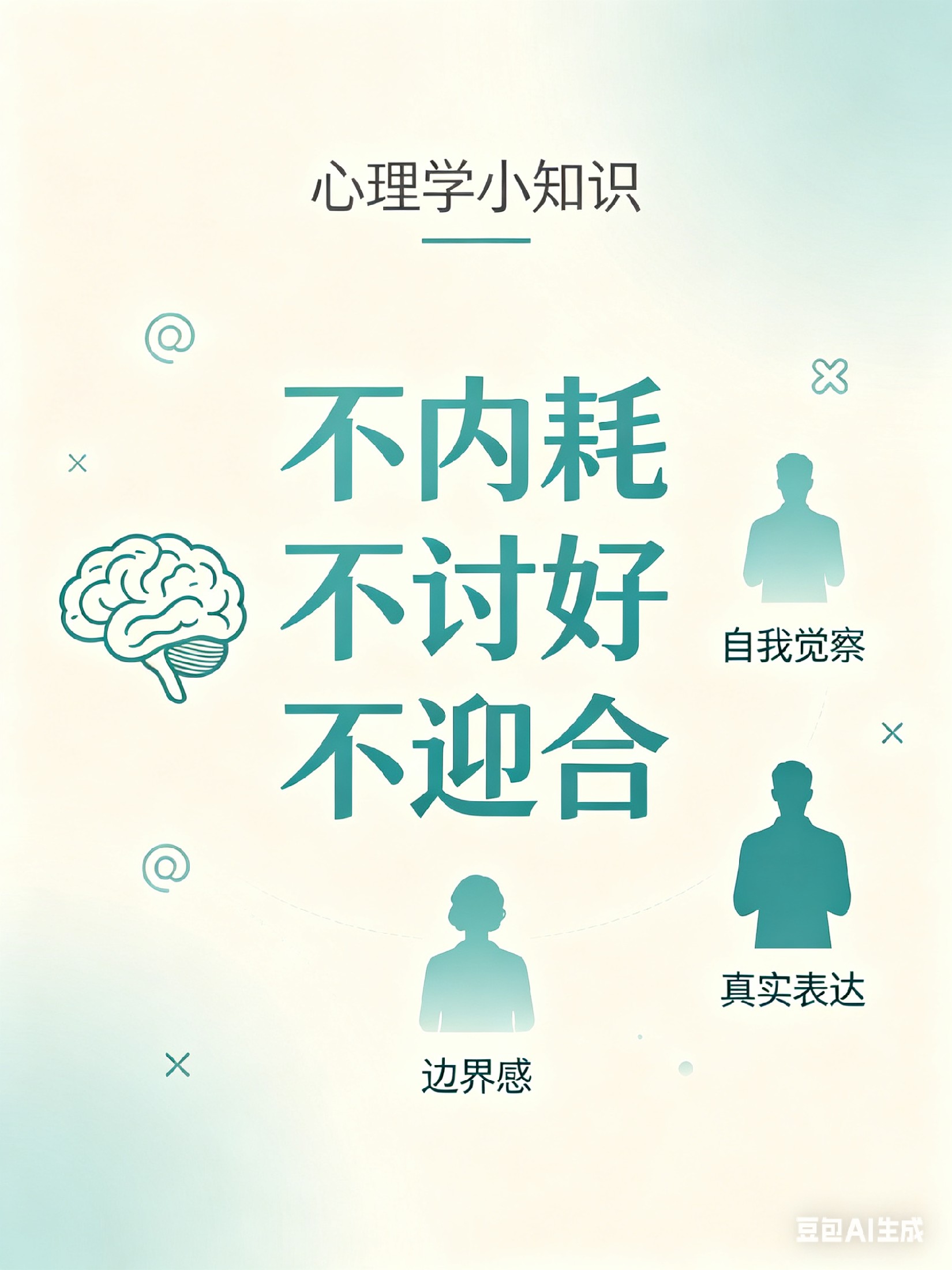小知識:不內耗 · 不討好 · 不迎合 1. 不內耗 停止反覆糾結、自我懷疑與精神拉扯,接納不完美,把精力留給行動。 2. 不討好 不必事事遷就他人,你的價值不需要靠委屈自己來證明。 3. 不迎合 守住邊界與本心,不隨波逐流,不勉強自己融入不適合的圈子。 先穩住自己,再善待世界,內心自洽,才是最高級的心理狀態。